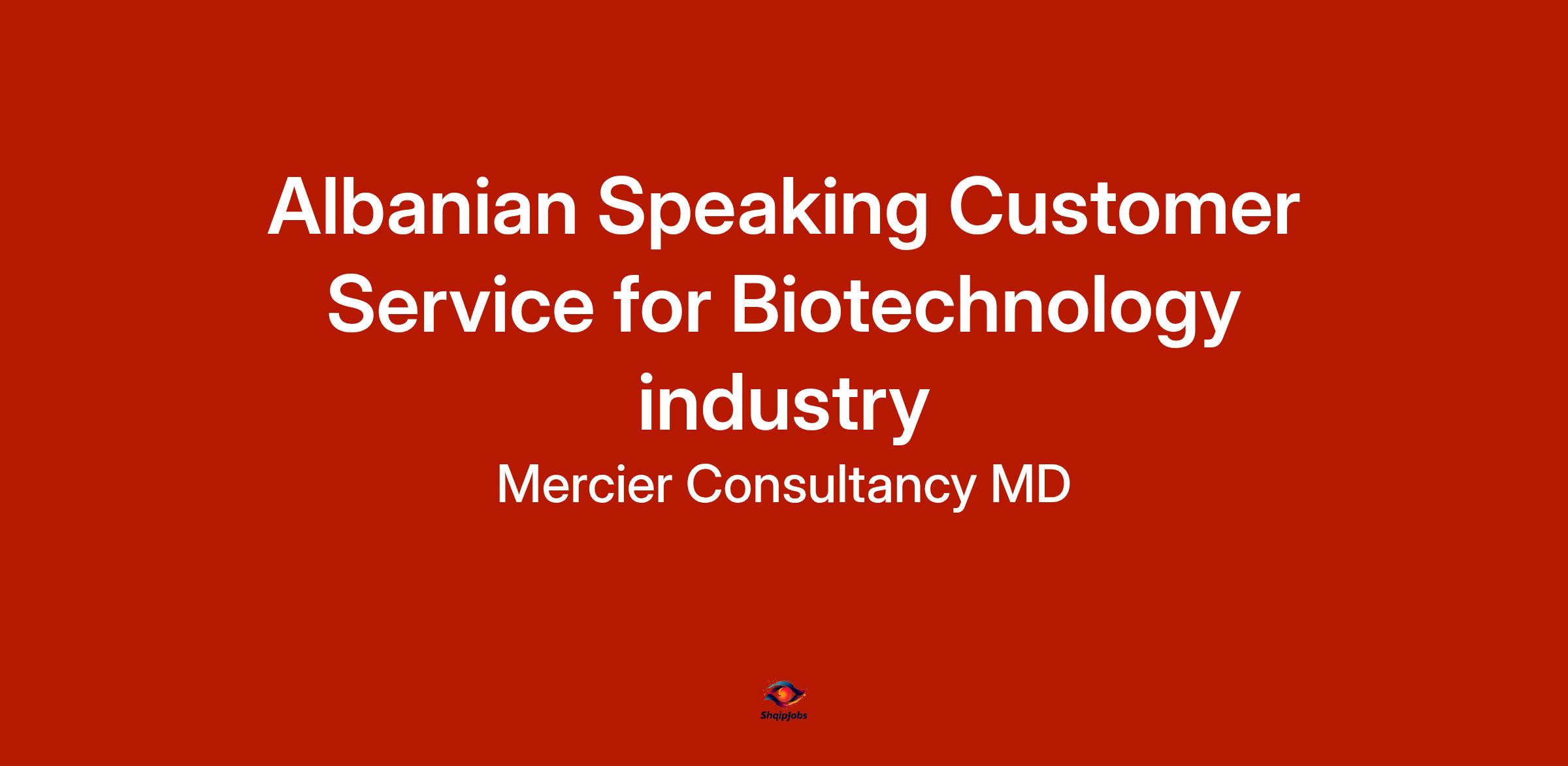 DescriptionMercier Consultancy MD is excited to offer a unique opportunity for Albanian Speaking Customer Service Representatives in the Biotechnology industry. If you have a keen interest in biotechnology and are passionate about delivering high-quality customer service, this role is tailored for you. You will assist clients in navigating our biotechnology services while providing exceptional support in Albanian.
